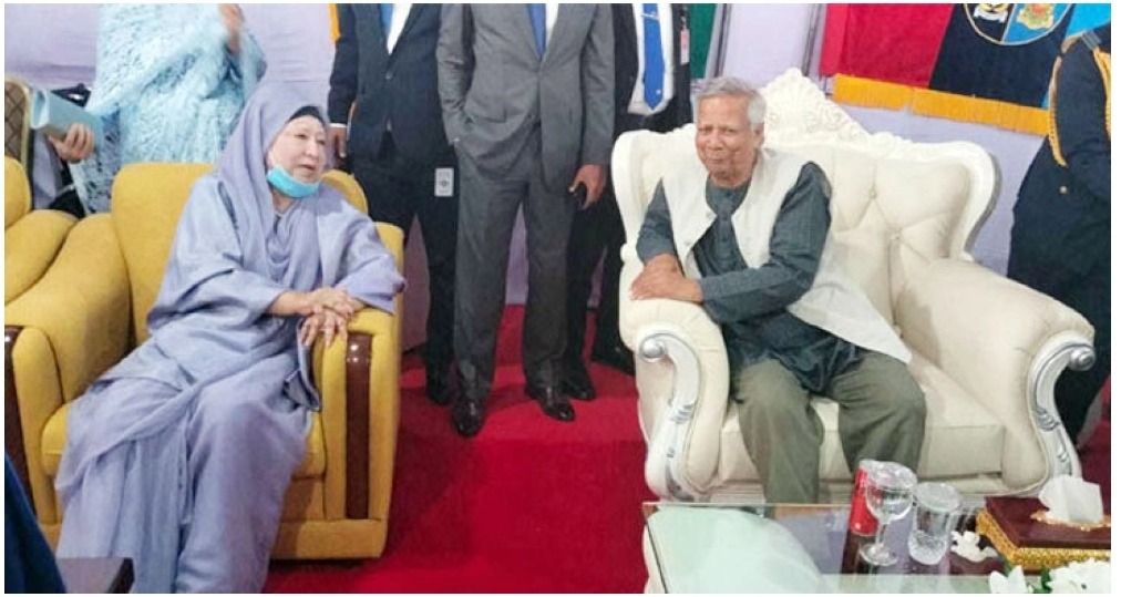 প্রধান উপদেষ্টার দেওয়া বৈকালিক সংবর্ধনা অনুষ্ঠানে অতিথিদের জন্য নির্ধারিত আসনে বসেন বিএনপি চেয়ারপারসন বেগম খালেদা জিয়া। তার পাশেই বসেন প্রধান উপদেষ্টা প্রফেসর ড. মুহাম্মদ ইউনূস।